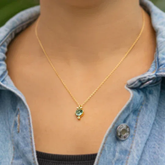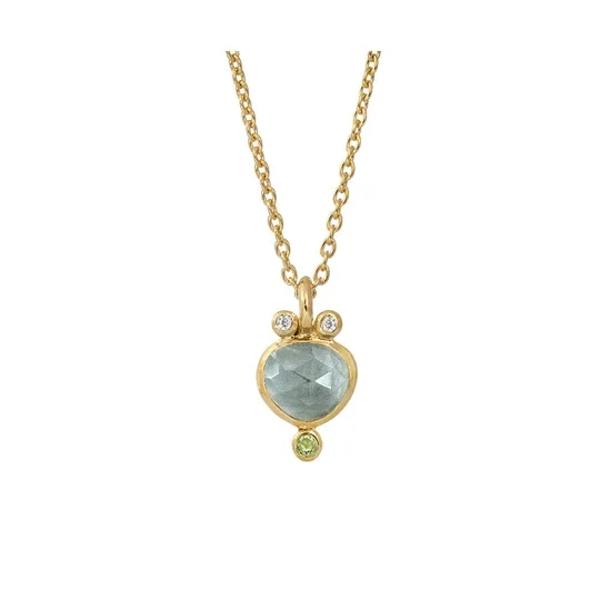 Deze geel goud vergulde ketting kan op zowel 42 cm als 45 cm gedragen worden. De hanger bevat een 8 x 7 mm roosgeslepen niervormige blauwe kwarts, een 2 mm ronde gefacetteerde peridoot en twee 1,5 mm ronde zirkonia's