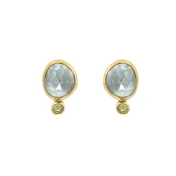 Deze geel goud vergulde oorknoppen hebben beide een 7 x 6 mm roosgeslepen niervormige blauwe kwarts en een 2 mm ronde gefacetteerde peridoot. De doorsnede van de oorknoppen zijn +/- 1 cm.
