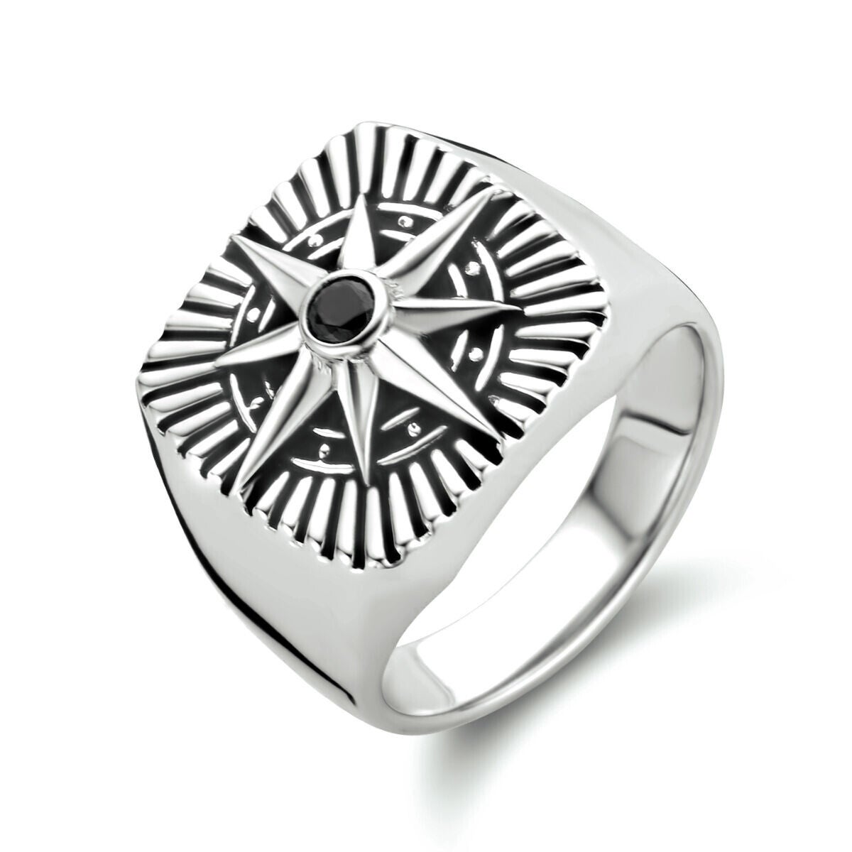 Gerhodineerd 925 zilveren zegelring uitgevoerd met een ster en een schitterende zwart zirkonia. De ring heeft een breedte van 16.5mm.