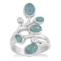 Deze sterling zilveren ring bevat prachtige aquamarijnen. Twee van 5 x 3 mm, twee van 7 x 5 mm en één van 6 x 4 mm. Tussen de aquamarijnen zitten een 2 mm ronde witte topaas en een 2,5 mm ronde witte topaas. De lengte van het element is +/- 3 cm.