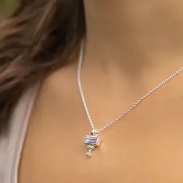 Deze sterling zilveren ketting kan op zowel 42 cm als 45 cm gedragen worden. De hanger bevat een 10 x 4 mm amethist octagon facetgeslepen, een ronde 2 mm gefacetteerde amethist en twee zirkonia's van 1,5 mm.