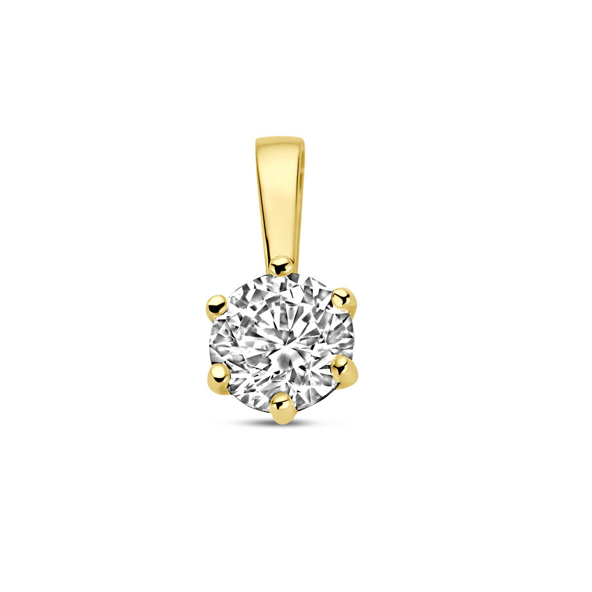 14k Geelgouden hanger uitgevoerd met een schitterende zirkonia. De hanger heeft een afmeting van 9x4.5mm.