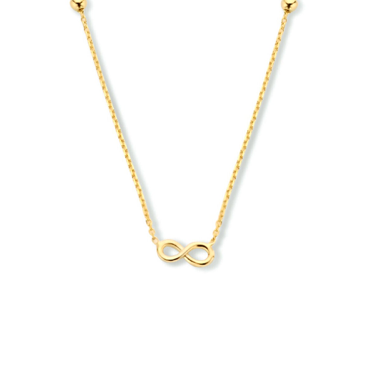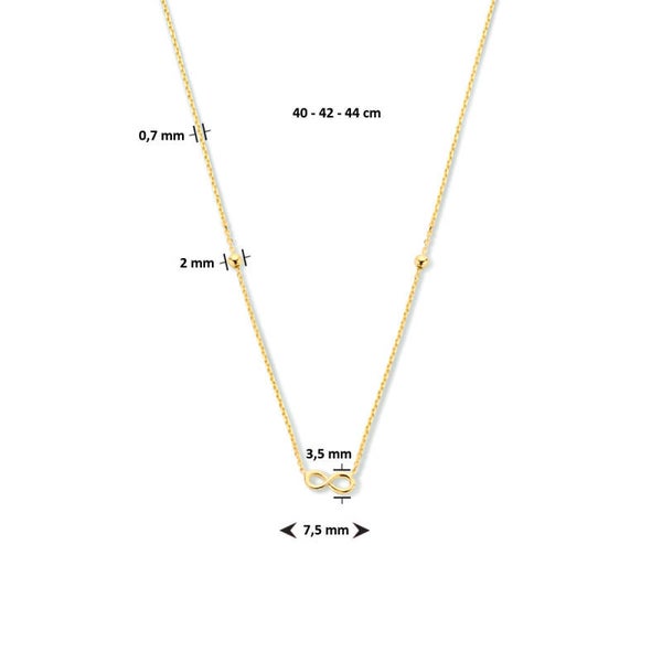 14k Geelgouden collier met een infinity hanger en bolletjes. Het collier heeft draaglengtes van 40, 42 en 44cm. De schakelbreedte is 0.7mm.