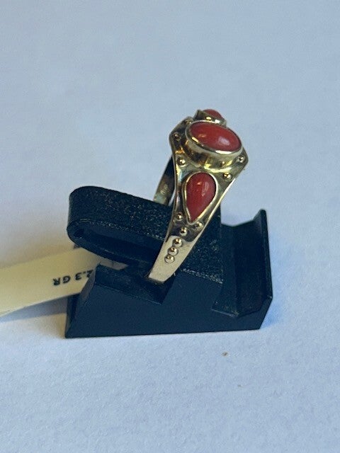 14KARAAT GOUDEN DAMESRING MET 3 BLOED KORAALTJES GEZET IN GLADDE KAST 2.3 GRAM IN DE MAAT 17 1/4