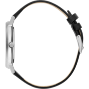 Helder ontwerp dat een grafische aantrekkingskracht benadert. Dit horloge geeft de tijd in zijn eenvoudigste vorm weer naast het extra datumvenster boven 'zes uur'. Een mannelijke kast van geborsteld roestvrij staal met PVD-coating past goed bij de gladde leren band.Case material: Stainless Steel