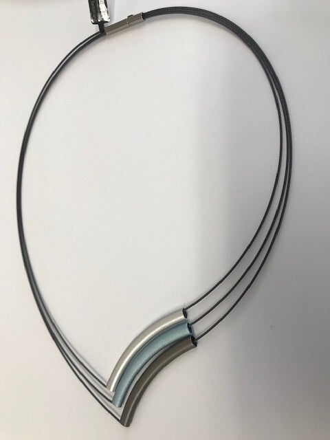 Step by Step collier op 3 zwarte rvs draad,met 3 ovale buuisjes in grey-zilver-l bleu .