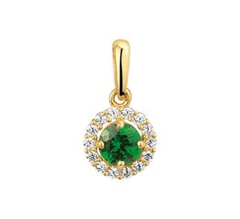 Geelgouden hanger met een totale hoogte van 1.3cm. Uitgevoerd met een synthetische smaragd en een rozet van briljant geslepen zirkonia, gewicht 0.32 gram.