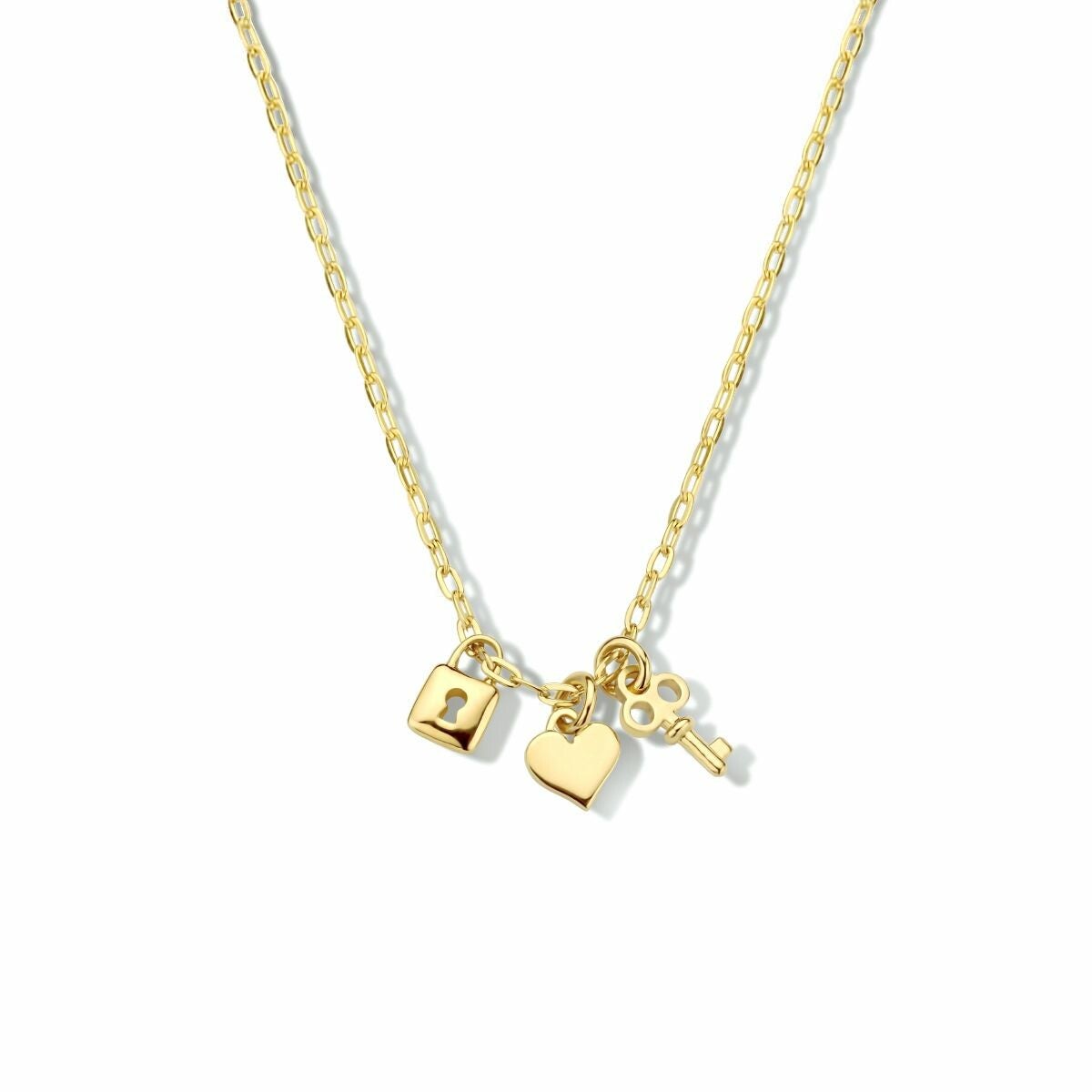 Geelgoud op 925 zilveren collier uitgevoerd met een slot, hart en sleutel. Het collier heeft een draaglengte van 41cm en een extensie van 4cm.