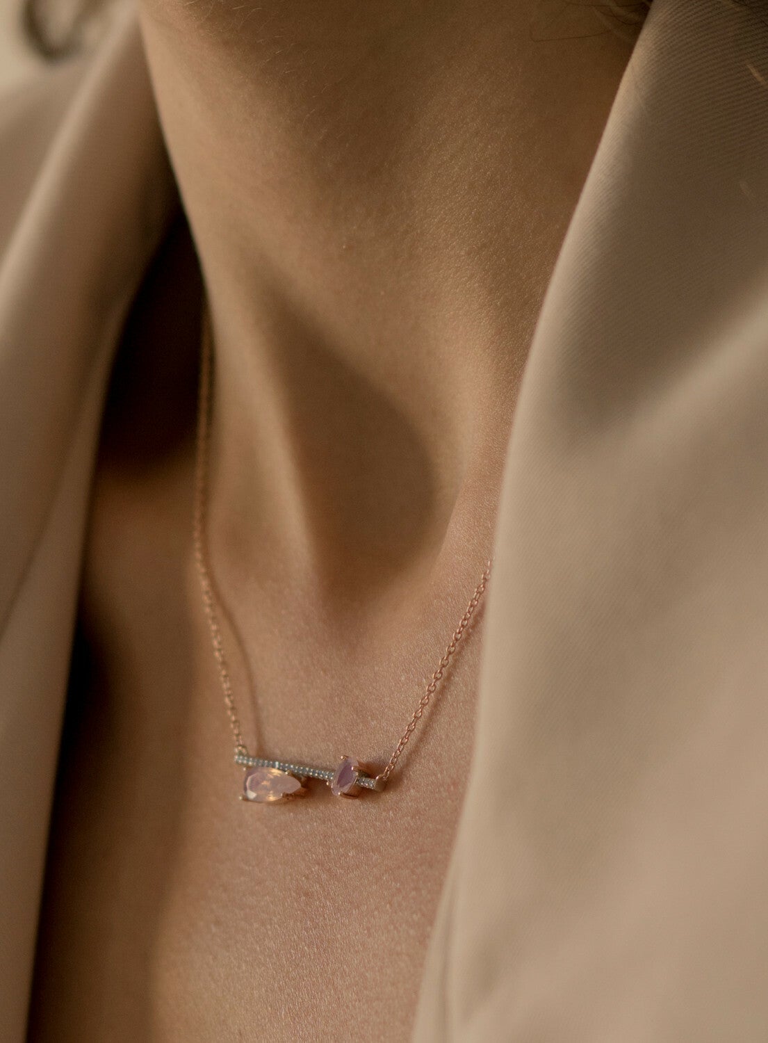 Stenen ketting gemaakt voor de vrouw in zilver. Perfect om een vleugje minimalisme aan je outfits toe te voegen. Rosé vergulde zilveren hanger met kleine zirkonen in een lineair motief en adamantine kwarts in een lichtroze tint. De ovale en peervormige adamantinekwarts in de hanger voegt creativiteit toe aan het stuk door te breken met het lineaire motief. Elegant en trendy.