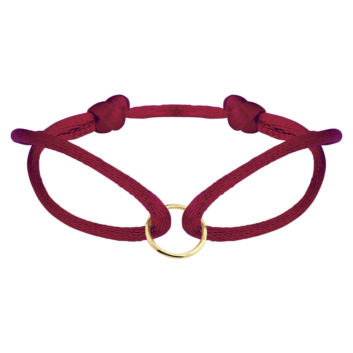 Bordeaux rood gevlochten armband uitgevoerd met een 14k geelgouden rondje. De armband heeft draaglengtes van 13 tot 26cm. Het rondje heeft een diameter van 10mm.